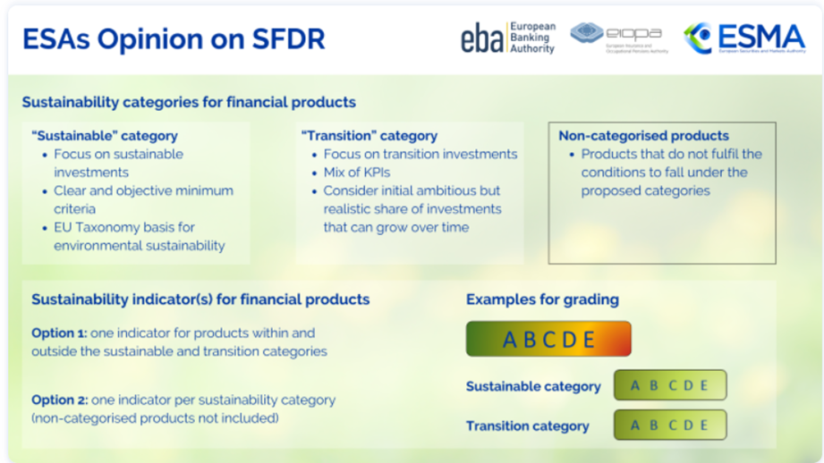 20. Las AES opinan que la introducción de categorías de productos con características de sostenibilidad mejorará la comprensión de los consumidores de las características de sostenibilidad de los productos financieros, que es lo que se pretende que los productos ofrezcan en términos de sostenibilidad. Dichas categorías sustituirían a la práctica actual de categorización de los artículos 8 y 9 del SFDR, es decir, los productos ya no estarían diferenciados entre los que promueven características medioambientales/sociales y los que tienen como objetivo la inversión sostenible.