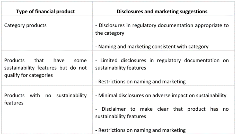 22. Las AES proponen que la divulgación de información en materia de sostenibilidad para los productos que entrarían en las nuevas categorías propuestas se ajuste para centrarse en el tema de la categoría. Los productos financieros que no calificarían para ninguna de las categorías podrían dividirse en productos financieros que tienen características de sostenibilidad y aquellos que no tienen características de sostenibilidad.