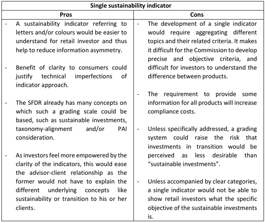 31. La elaboración de un indicador de sostenibilidad no está exenta de riesgos y desafíos técnicos. En el cuadro que figura a continuación, las AES han resumido algunos pros y contras de que un único indicador funcione en todos los productos.