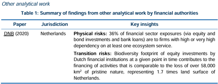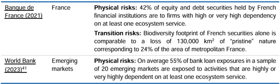 Con el fin de obtener una mejor comprensión de las necesidades de datos y aumentar la concienciación sobre los riesgos de la naturaleza en el sistema financiero, algunas autoridades han iniciado trabajos exploratorios para evaluar la dependencia del sector financiero y la exposición a los riesgos financieros relacionados con la naturaleza. Esto puede implicar la evaluación de los riesgos físicos mediante el cálculo de las exposiciones de las instituciones financieras a través de actividades de financiación e inversión a las contrapartes (empresas, hogares, gobiernos) y su dependencia de los servicios ecosistémicos. La magnitud de las pérdidas financieras derivadas de esas exposiciones financieras dependería de la gravedad de la perturbación y de la resiliencia de las empresas financieras y no financieras. En el caso de los riesgos de transición, las métricas de impacto incluyen el cálculo de la financiación de actividades que suponen un daño a la naturaleza y, por lo tanto, reflejan la vulnerabilidad a ser afectadas por un shock de transición de la biodiversidad. Una de esas métricas es la huella de biodiversidad, que se define como la contribución de las actividades económicas a la pérdida de especies y poblaciones en los ecosistemas en comparación con la situación «prístina».