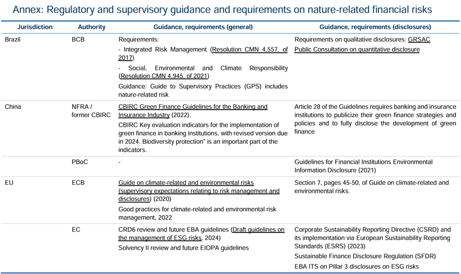 Las autoridades financieras dentro de las jurisdicciones miembros del FSB se encuentran en diferentes etapas de considerar si la pérdida de biodiversidad u otros riesgos relacionados con la naturaleza deben incluirse en su trabajo general sobre riesgos financieros. Algunas autoridades ya han llevado a cabo su propia labor analítica sobre el tema y han llegado a la conclusión de que se trata de un riesgo financiero pertinente para sus jurisdicciones. En la actualidad, otras autoridades se encuentran en la etapa de supervisión más amplia de la labor sobre el tema a nivel internacional. Otras autoridades han decidido no trabajar en este tema, debido a la falta de datos y a la necesidad de dar suficiente prioridad a los riesgos climáticos (donde el pensamiento analítico y los datos siguen avanzando).