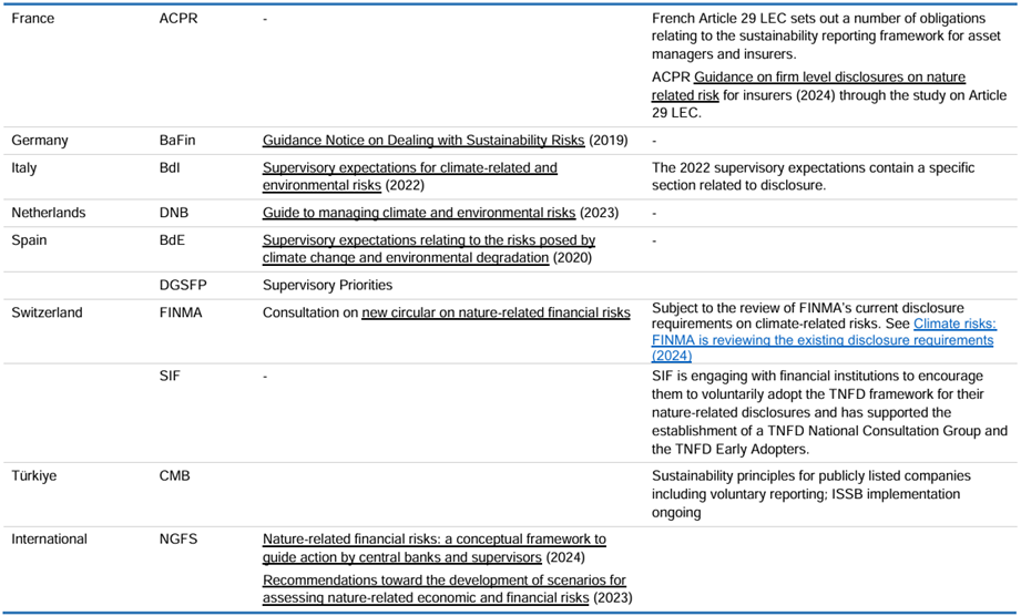 Al igual que en el caso de los riesgos relacionados con el clima, la promoción de la divulgación de información a nivel de las empresas sobre los riesgos relacionados con la naturaleza suele constituir un componente importante de los enfoques de regulación y supervisión para gestionar dichos riesgos. Una serie de autoridades financieras que han emitido directrices o requisitos sobre la divulgación de información incluyen los riesgos relacionados con la naturaleza como parte de la divulgación de información más amplia en materia de sostenibilidad. Señalan que las prácticas de divulgación relacionadas con la naturaleza se encuentran generalmente en una etapa más temprana que las divulgaciones relacionadas con el clima, y varias autoridades señalan que el TNFD desempeña un papel de coordinación voluntaria similar al que el TCFD desempeñó para el clima.