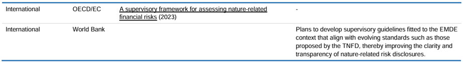 Algunas autoridades consideran que los riesgos de la naturaleza forman parte de sus marcos nacionales de sostenibilidad más amplios, que proporcionan el marco institucional dentro del cual puede tener lugar cualquier trabajo futuro. Por ejemplo, el Tesoro australiano considera los riesgos relacionados con la naturaleza como parte de la estrategia de finanzas sostenibles del gobierno, que reconoce la importancia de los problemas relacionados con la naturaleza para las empresas y sus cadenas de suministro. Otros ejemplos incluyen el trabajo en curso de SAMA sobre el Marco de Riesgos Financieros Relacionados con el Medio Ambiente y las Directrices de Finanzas Verdes9 que están siendo actualizadas por la NFRA de China para considerar los riesgos de la naturaleza.