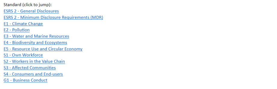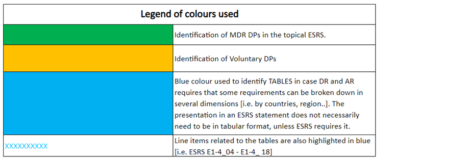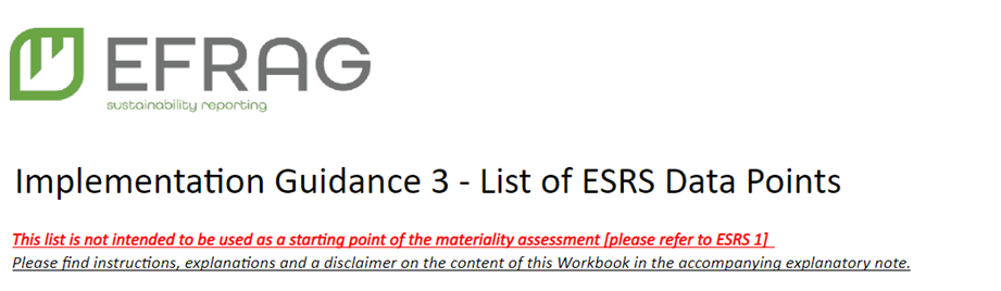 IG 3: Lista de puntos de datos ESRS traduce la lista completa del Conjunto 1 de ESRS de requisitos detallados en cada Requisito de divulgación y Requisitos de aplicación relacionados en formato Excel. El expediente contiene información adicional, como los tipos de requisitos (por ejemplo, cuantitativos o cualitativos) o si están sujetos a disposiciones transitorias. Esta lista puede constituir la base para un análisis de lagunas de datos o un ejercicio de recopilación de datos. Nota explicativa disponible aquí y declaración de comentarios aquí.
