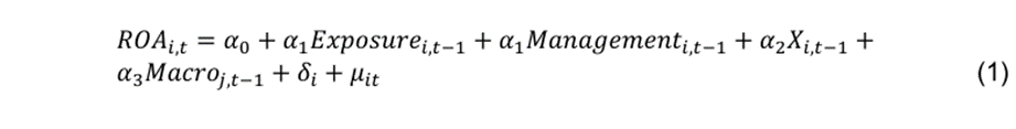 donde i, j y t denotan las empresas, las provincias donde están ubicadas las empresas y los índices de tiempo, respectivamente. Exposición, representa la puntuación de exposición de las empresas a los riesgos del cambio climático. La gestión, que representa la puntuación de gestión de las empresas sobre los riesgos del cambio climático, sustituye la puntuación de exposición para evaluar el efecto de la gestión del cambio climático en el ROA. δ representa un efecto fijo firme, mientras que μ, es el término de error. También ejecutamos especificaciones de regresión para áreas costeras y grupos de altos ingresos y examinamos los efectos retardados del cambio climático utilizando un nivel de rezago más alto, basándonos en la literatura relacionada.