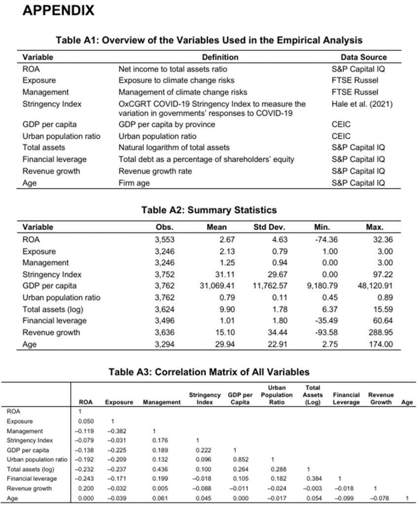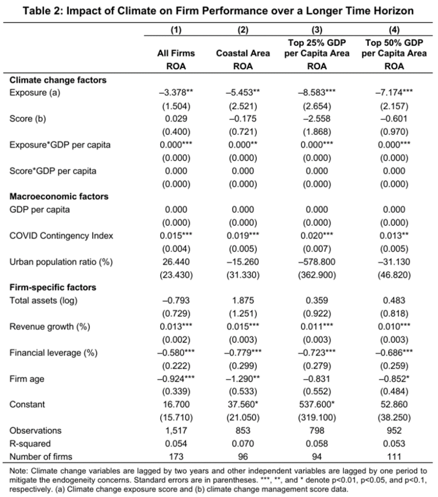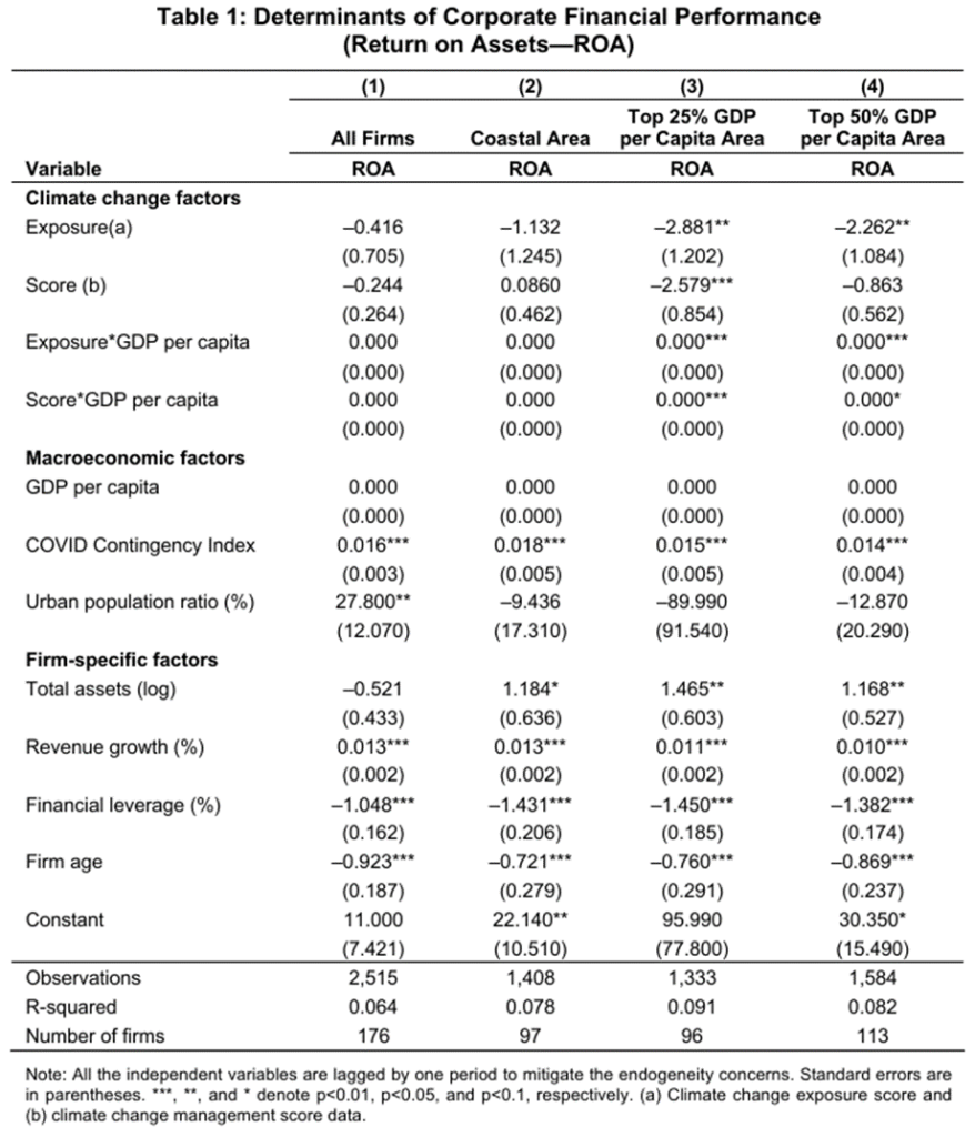 Los resultados empíricos sugieren que las actividades que reducen la exposición al cambio climático (como la integración de la consideración climática en las estrategias comerciales y la implementación de iniciativas de reducción de emisiones) podrían mejorar el desempeño de las empresas, especialmente para las empresas ubicadas en áreas costeras y provincias de ingresos más altos.