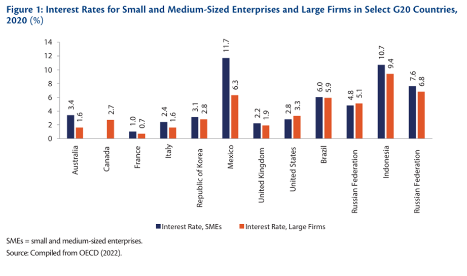 Las dificultades que enfrentan las mipymes para acceder al financiamiento son consecuencia de múltiples factores. La insuficiencia de las garantías, la incapacidad de verificar la solvencia de las empresas y los altos costos de transacción de otorgar préstamos de pequeño tamaño a las mipymes tienden a hacer que los préstamos a este sector sean poco atractivos (IFC 2017; Banco Asiático de Desarrollo 2022).2 Además, las empresas más pequeñas a menudo no tienen planes de negocios financiables. En ausencia de tales planes, la demanda y la necesidad de garantías de calidad se vuelven más significativas. Otro desafío clave se refiere a la falta de infraestructura de información para las pymes, lo que exacerba la asimetría de información entre los proveedores y los demandantes de fondos (ADB 2022). A diferencia de las grandes empresas, las PYMES tienen poca o ninguna conexión con los mercados de capitales y las instituciones financieras no pueden observar continuamente a los prestatarios de pequeños préstamos sin incurrir en costos significativos. Por lo tanto, las mipymes son percibidas como más riesgosas desde el punto de vista de los prestamistas. Es importante destacar que los desafíos de la asimetría de la información, el alto riesgo de incumplimiento y la falta de garantías también dan como resultado un mayor costo del crédito para las pymes en comparación con las empresas más grandes (Figura 1). En consecuencia, las pymes experimentan un importante déficit de financiación y se ven obligadas a depender de los ahorros personales y de los préstamos de amigos y familiares.