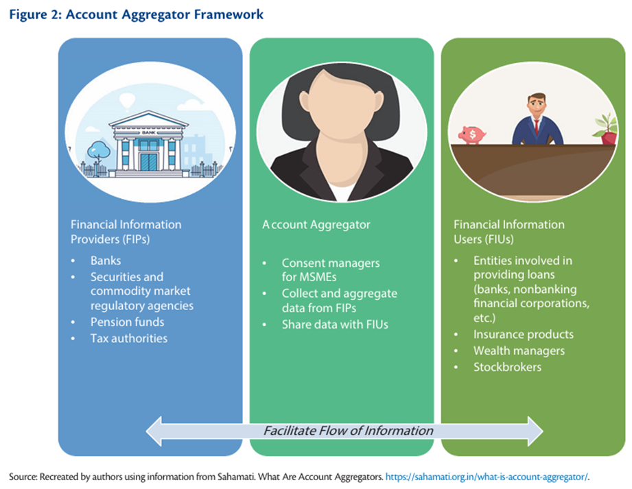 Vale la pena mencionar aquí que la agregación de información financiera no es un concepto nuevo. Tanto Estados Unidos como Europa tienen redes de agregación de cuentas que reúnen información de diferentes cuentas financieras en un solo lugar, utilizando conexiones directas, raspado de pantalla y una interfaz de programación de aplicaciones de datos (API). Sin embargo, existen desafíos regulatorios y de implementación. Por ejemplo, la implementación de marcos Open API tiene limitaciones tanto en lo que respecta a la naturaleza de los datos que se pueden compartir como al marco para la gestión del consentimiento del usuario. En el caso de las MiPymes, el tipo de datos que se pueden compartir marca una diferencia significativa, especialmente los datos relacionados con el flujo de caja, entre otras cosas. De hecho, Brasil, que ostenta la actual presidencia del G20, también tiene un mecanismo de banca abierta, que tiene similitudes con la red india AA (Box).