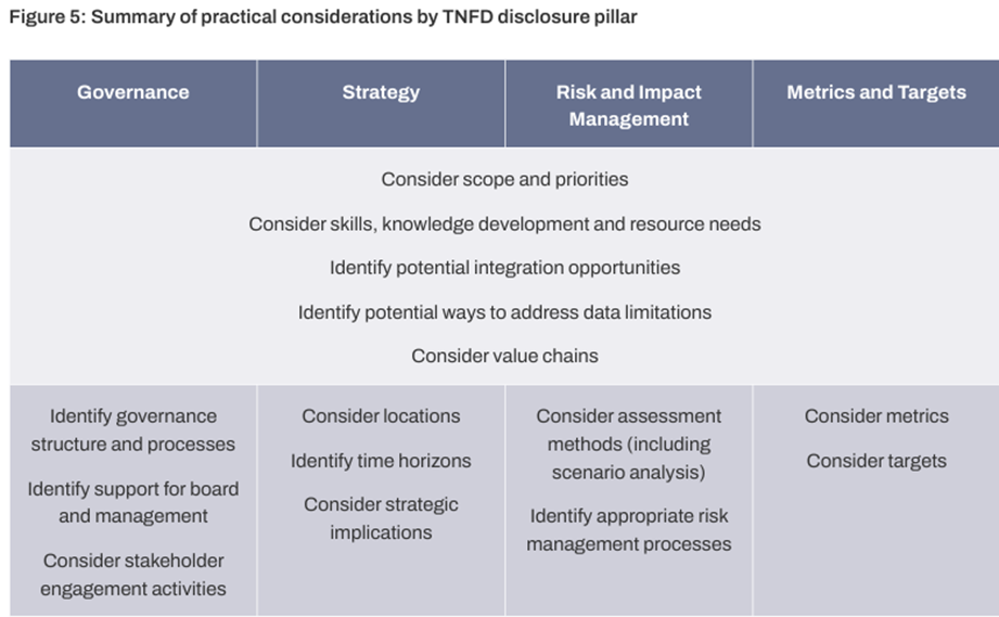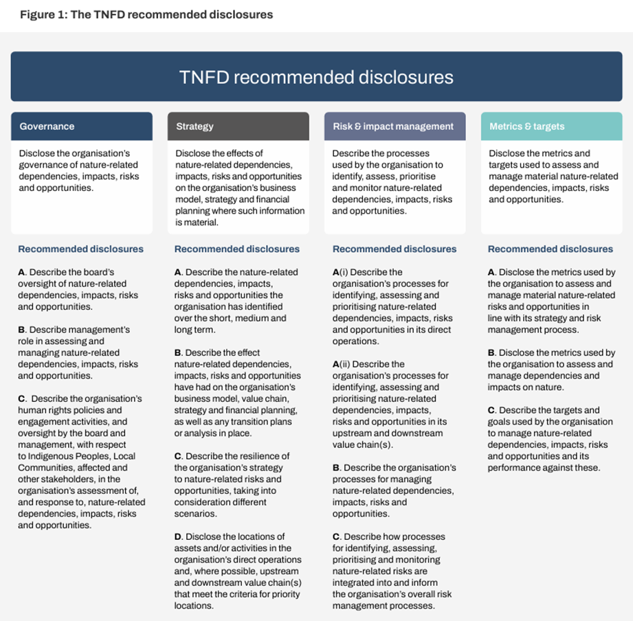 Las 11 recomendaciones del TCFD se han replicado en las recomendaciones del TNFD. Esto brinda la oportunidad para que los informantes existentes del TCFD busquen de inmediato oportunidades para hacer divulgaciones similares con respecto a la naturaleza y proporcionar a sus inversores y otros usuarios de informes integrados de sostenibilidad del TCFD y el TNFD.