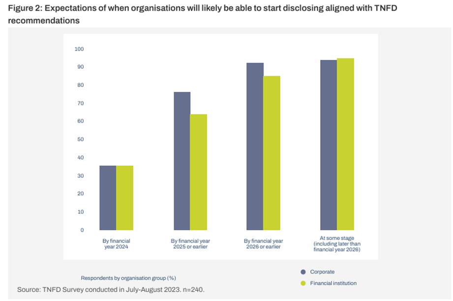 Más de dos tercios (70%) pensaron que podrían comenzar a divulgar alineados con las recomendaciones de TNFD para su año financiero 2025, y el 86% para su año financiero 2026 o antes. Las respuestas positivas a corto plazo provinieron de las empresas en comparación con las instituciones financieras, ya que alrededor de tres cuartas partes (76%) de las empresas y poco menos de dos tercios (63%) de las instituciones financieras sugirieron que podrían divulgar información para 2025 o antes (gráfico 2).
