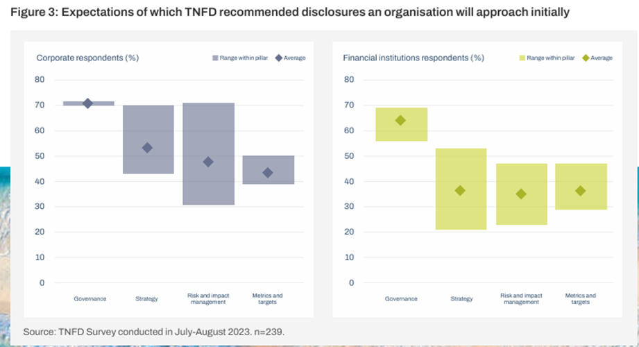 El encuestado promedio sugirió que comenzaría divulgando la mitad (7) de las 14 divulgaciones recomendadas por TNFD. Hubo una variación significativa entre las empresas y las instituciones financieras sobre las divulgaciones con las que comenzarían, lo que subraya cómo los modelos de negocio y las capacidades internas afectan el enfoque de una organización (Figura 3). Las divulgaciones recomendadas con una mayor proporción de respuestas positivas reflejaron ampliamente las divulgaciones recomendadas por el TCFD que tenían un mayor volumen de informes tempranos.