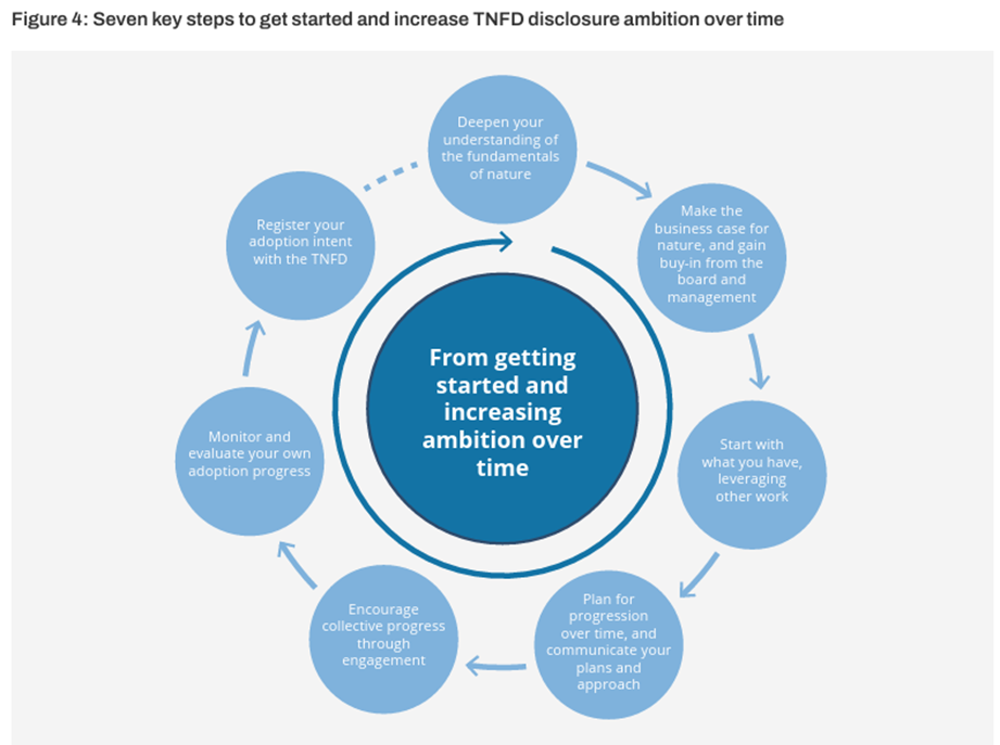 El TNFD reconoce que la comprensión de la importancia de las cuestiones relacionadas con la naturaleza en una organización, la recopilación de la información necesaria y la realización de análisis pertinentes llevará tiempo y recursos. Ya sea en relación con el clima, la esclavitud moderna, la ciberseguridad u otros vectores de riesgo, las organizaciones están familiarizadas con la necesidad de adaptar y evolucionar sus procesos de gestión de riesgos y de informes corporativos a medida que surgen nuevos problemas y desafíos.