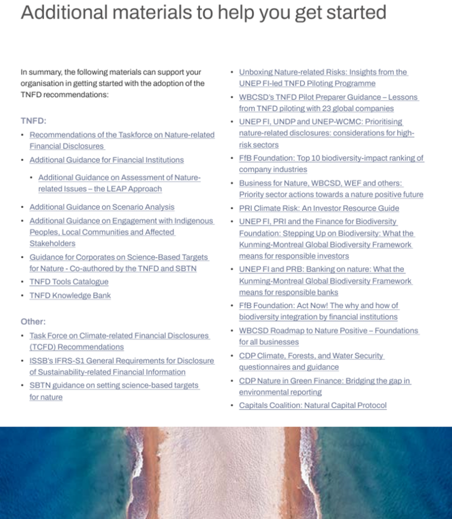 El TNFD ha elaborado un conjunto de recomendaciones y orientaciones adicionales para ayudar a varias organizaciones a comenzar con la identificación, evaluación, gestión y divulgación de sus problemas relacionados con la naturaleza material. Las recomendaciones del TNFD son coherentes con los objetivos de las políticas globales y los estándares internacionales de informes de sostenibilidad, se basan en la ciencia y están diseñadas para permitir que las organizaciones de todas las jurisdicciones comiencen ahora y aumenten su ambición de divulgación con el tiempo.