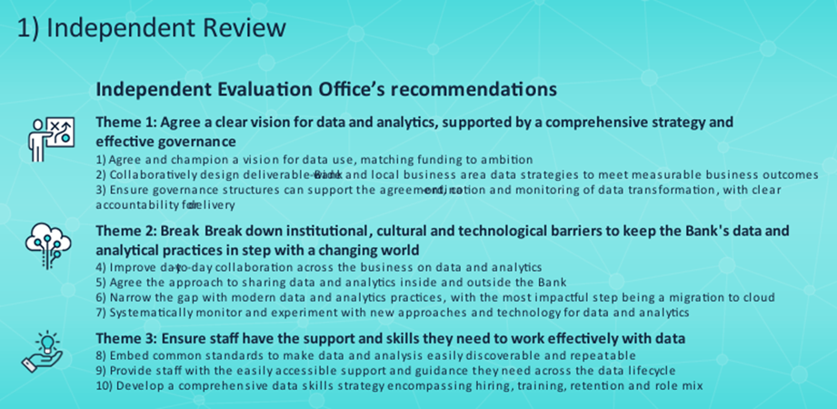 El informe establece diez recomendaciones detalladas, en torno a tres temas clave. En la primera se pedía que el Banco acordara una visión clara y actualizada de los datos y la analítica, respaldada por una estrategia y una gobernanza integrales. El segundo recomienda la eliminación de las barreras institucionales, culturales y tecnológicas. El tercero nos animó a ampliar y profundizar nuestros esfuerzos para dotar al personal de las herramientas y habilidades necesarias para trabajar eficazmente con los datos.