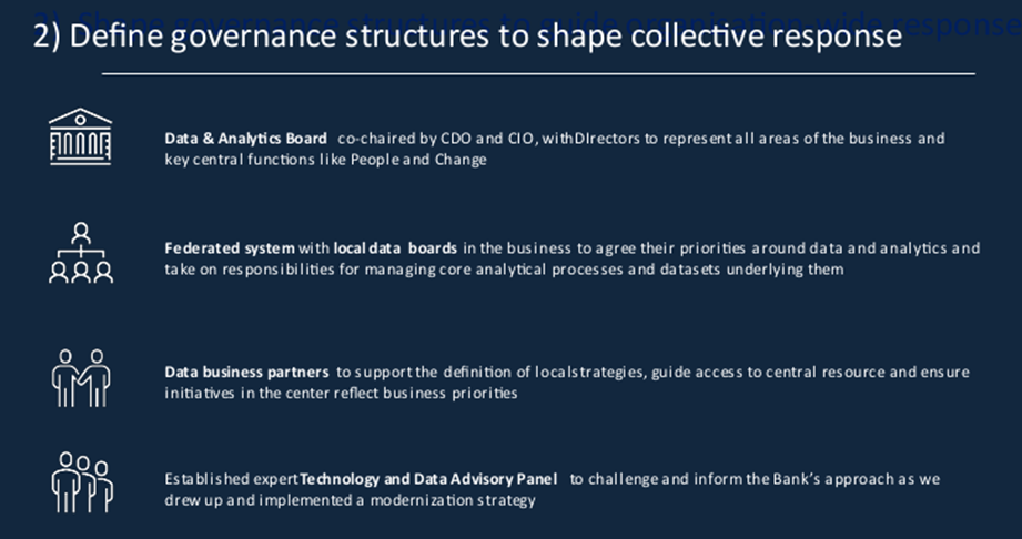 Reúne un sistema federado de tableros de datos locales. Cada uno acuerda las prioridades para las áreas del negocio, haciendo su propio llamado a la estrategia general y poniendo en marcha proyectos para satisfacer las necesidades locales. La creación de ese sistema ha catalizado a todas las partes del Banco para que sean claras y específicas en torno a sus prioridades para mejorar la forma en que utilizan los datos para respaldar sus objetivos comerciales y está ayudando a reforzar las responsabilidades en torno a los procesos analíticos críticos y los conjuntos de datos que los alimentan.