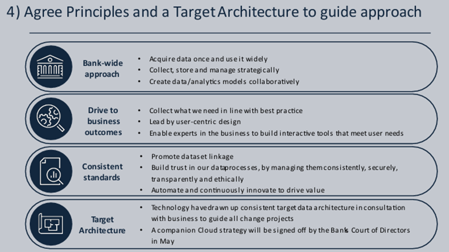 Un paso importante e inmediatamente impactante ha sido el trabajo rápido en Tecnología para elaborar una arquitectura de datos objetivo para cumplir con los objetivos de la estrategia y encarnar los principios para que haya cumplimiento de ellos por diseño. En su corazón se encuentra una nueva estrategia en la nube y la ambición de administrar los datos del Banco en la nube a menos que haya una razón de peso para no hacerlo. Los componentes de la arquitectura ya han sido acordados. Ahora es la estrella polar de todos los proyectos y programas en marcha que encarnan el cambio tecnológico en el Banco, lo que garantiza que cada uno de ellos trabaje en pos de la estrategia de datos.