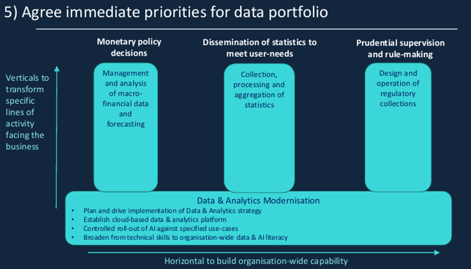 • En tercer lugar, transformar el enfoque del Banco para la recopilación de datos regulatorios, a través de un enfoque gradual para la entrega que se alinee con la «Revisión de Datos Bancarios» planificada para la presentación de informes regulatorios.