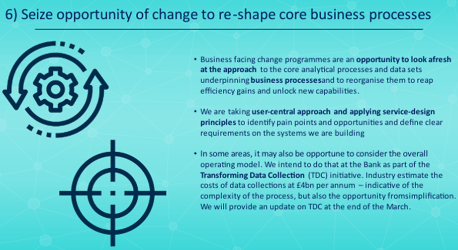 Lo más ambicioso aquí son nuestros planes para transformar la recopilación de datos, junto con la Autoridad de Conducta Financiera (FCA). Reportar al Banco y a la FCA es una actividad compleja y de gran envergadura. En 2019, el coste anual de las obligaciones de información para los bancos del Reino Unido se estimó entre 2.000 y 4.000 millones de libras esterlinas5, un indicador tanto de la magnitud del reto como de la magnitud del premio potencial. El objetivo es construir un sistema que proporcione los datos correctos al menor costo posible. Aunque nuestro enfoque principal, dado el imperativo de la Revisión de Datos Bancarios, se centra en los datos recopilados de los bancos, la ambición es construir un nuevo enfoque y marco que pueda aplicarse de manera más amplia a otros cobros en el Banco. A finales de mes, publicaremos una actualización para la industria sobre nuestros planes conjuntos con la FCA para el próximo año.