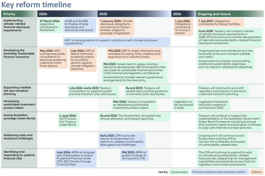Los requisitos de divulgación del plan de transición corporativa de Australia estarán contenidos en el nuevo régimen de divulgación climática para grandes empresas e instituciones financieras. Estos requisitos se implementarán progresivamente a partir del 1 de enero de 2025, sujeto a la aprobación de la legislación (véase la prioridad 1).