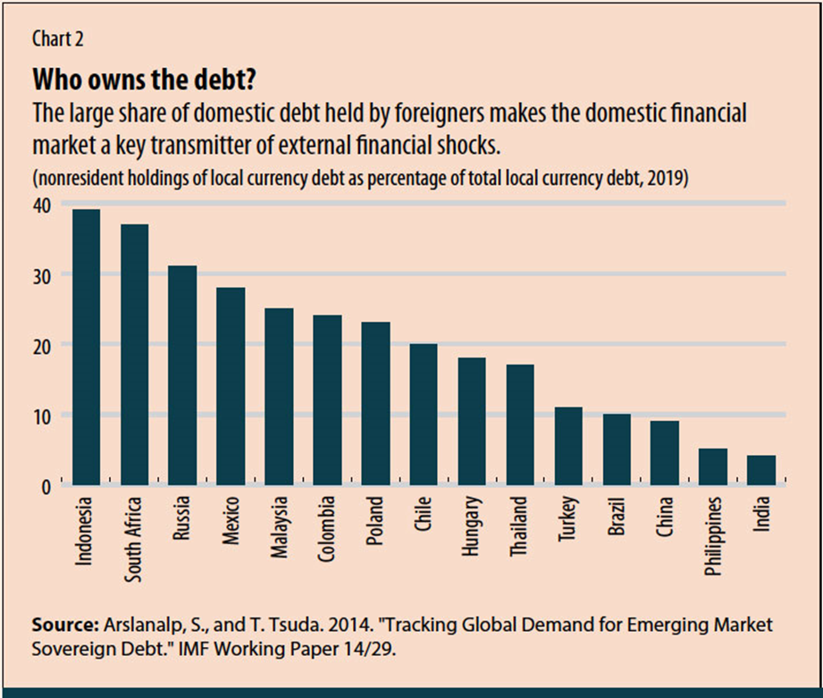 Los gobiernos de muchos mercados emergentes tendrán que buscar un equilibrio entre distintos objetivos, como aumentar el gasto en inversión pública y seguridad social, y reanudar al mismo tiempo la consolidación fiscal para mantener la deuda pública en una trayectoria firme a la baja. La deuda pública y externa han aumentado significativamente en la economía emergente mediana, alcanzando el 59% y el 44% del PIB, respectivamente, en 2020, y se proyecta que las necesidades de financiamiento bruto se mantendrán por encima del 10% del PIB en 2020-21. Si bien las bajas tasas de interés mundiales han mantenido manejables los costos del servicio de la deuda, no se debe esperar que los costos de endeudamiento externo se mantengan bajos indefinidamente. Los inversionistas suelen diferenciar la deuda de los mercados emergentes (véase el gráfico 1). Incluso cuando la deuda se contrae en moneda nacional, la considerable proporción de deuda interna en manos de extranjeros hace que el mercado financiero interno sea un importante transmisor de shocks financieros externos (véase el gráfico 2). La sostenida elevación de la deuda y las necesidades de financiamiento bruto probablemente agravarán las disyuntivas entre políticas y expondrán a los mercados emergentes a cambios abruptos en el apetito de riesgo de los inversionistas.