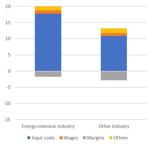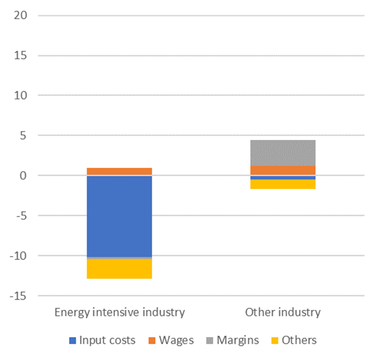 Los gráficos 1 y 2 desglosan el cambio en las ventas por trabajador en 2021-22 y 2022-23 en contribuciones de los costos de insumos, los salarios y los márgenes de ganancia.[2]Los sectores con un uso intensivo de la energía y otros sectores se han adaptado de forma diferente al shock de los precios de la energía. En 2022 (gráfico 1) se produjo un aumento sustancial de más del 10% en las ventas nominales por trabajador en general, vinculado principalmente con el aumento de los costos de los insumos (barra azul), en particular para los sectores con un uso intensivo de la energía. Ambos grupos de empresas renunciaron a una parte de sus márgenes para amortiguar el aumento de los costos. En 2023, los mercados energéticos se normalizaron y las empresas con un uso intensivo de la energía experimentaron caídas significativas en los costos de los insumos debido a la caída de los precios de la energía. Por lo tanto, esto debería haber facilitado la vida a las industrias con un uso intensivo de la energía. Y, sin embargo, sus márgenes de beneficio no se recuperaron, como se muestra en el gráfico 2. Por el contrario, las empresas menos dependientes de la energía, que no experimentaron ninguna caída significativa en los costos de los insumos, lograron restablecer sus márgenes y compensaron los retrocesos de rentabilidad anteriores.