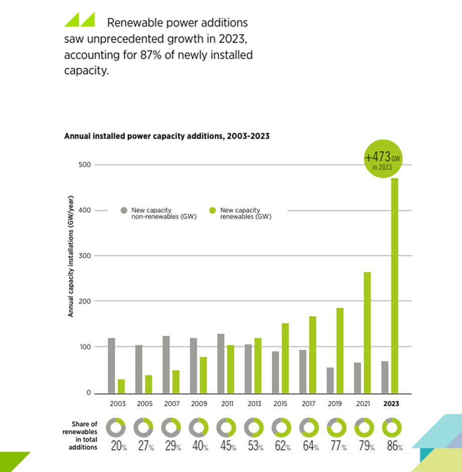 Triplicar la capacidad de energía renovable para 2030 es técnicamente factible y económicamente viable, pero requiere compromiso, apoyo político e inversión a escala. El seguimiento y el análisis de IRENA sobre el desarrollo y el despliegue de las energías renovables ha demostrado que la madurez tecnológica alcanzada en el campo de las energías renovables, respaldada por políticas facilitadoras, competitividad y recursos generalizados, ha posicionado a la industria en el centro de las estrategias climáticas, de desarrollo y de seguridad energética. Desde 2015, las adiciones de energía renovable han superado sistemáticamente a las nuevas instalaciones de energía nuclear y de combustibles fósiles combinadas, alcanzando un estimado de 473 gigavatios (GW) solo en 2023. Sin embargo, triplicar las energías renovables a nivel mundial también requerirá un progreso considerable en otros lugares, incluidas inversiones aceleradas en infraestructura y operación de sistemas (por ejemplo, redes eléctricas, almacenamiento); políticas y reglamentos actualizados (por ejemplo, diseño y regulación del mercado eléctrico, racionalización de los permisos); medidas para fortalecer las cadenas de suministro y desarrollar capacidades relacionadas con la transición; y un importante aumento de la inversión, incluidos los fondos públicos respaldados por la colaboración internacional.