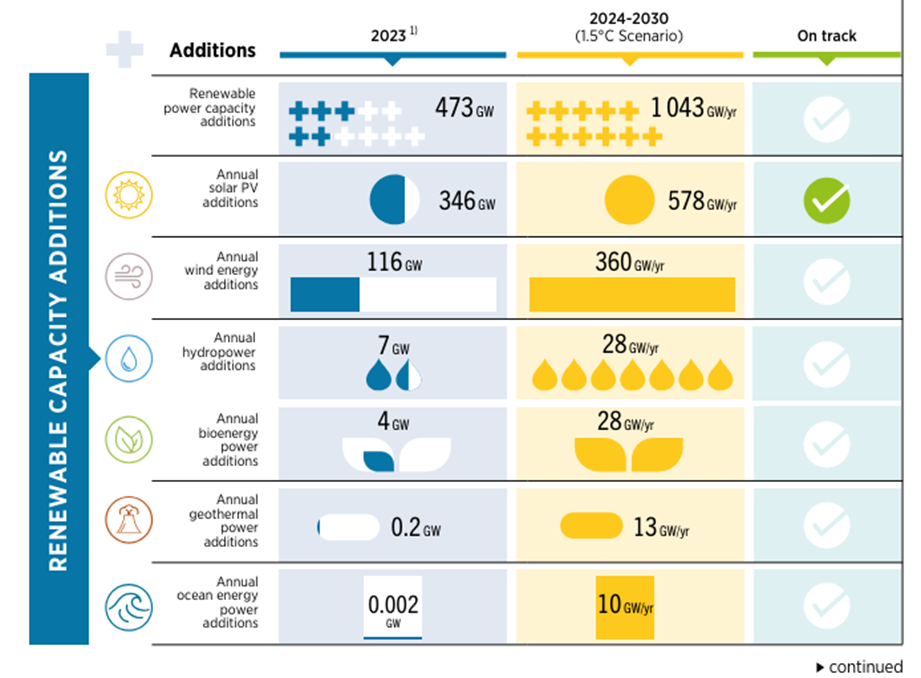 La capacidad del mundo para alcanzar el objetivo de triplicar está lejos de estar asegurada, ya que se deben desplegar 7,2 TW adicionales de energía renovable para alcanzar los 11 TW requeridos para 2030. Los datos globales indican tendencias positivas en la expansión de la energía renovable y el despliegue anual récord de 473 GW en 2023 es oportuno. Sin embargo, las proyecciones actuales para los próximos siete años sugieren que no alcanzaremos el objetivo de triplicar si no se realizan intervenciones políticas urgentes. Según el escenario de 1,5 °C de IRENA, solo el Grupo de los 20 (G20) necesitaría aumentar su capacidad de energía renovable de menos de 3 TW en 2022 a 9,4 TW en 2030, lo que representa más del 80% del total mundial. Los compromisos asumidos a partir de octubre de 2023 en las contribuciones determinadas a nivel nacional (NDC, por sus siglas en inglés) al Acuerdo de París son menos de la mitad de los necesarios para cumplir el compromiso mundial de triplicar la capacidad de energía renovable, mientras que los asumidos en los planes y políticas energéticas nacionales se quedan cortos en aproximadamente un 30 %.