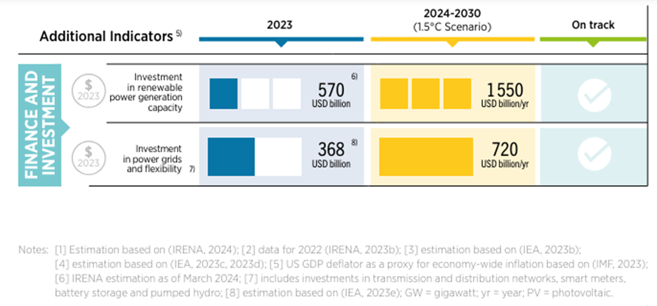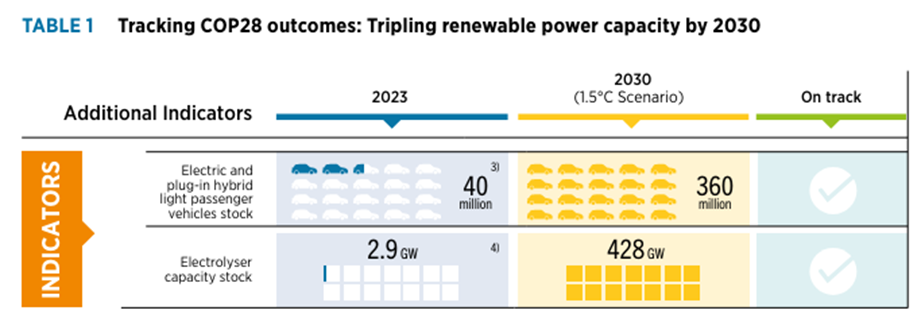 A pesar de las incorporaciones récord de capacidad de energía renovable, los avances en la transición energética son insuficientes y su trayectoria está marcadamente fuera de curso. El escenario de 1,5 °C de IRENA, un elemento clave en el marco intelectual subyacente de las Perspectivas de las Transiciones Energéticas en el Mundo de la Agencia, muestra que se requiere nada menos que una transformación sistémica e integral del sistema energético en todos los sectores (IRENA, 2023a). Los últimos datos muestran avances insuficientes, especialmente en relación con la triplicación de la capacidad de energía renovable para 2030, el desarrollo de vehículos eléctricos, la capacidad de electrolizadores para la producción de hidrógeno verde y el aumento de las inversiones en generación de energía renovable, redes y flexibilidad (Tabla 1).