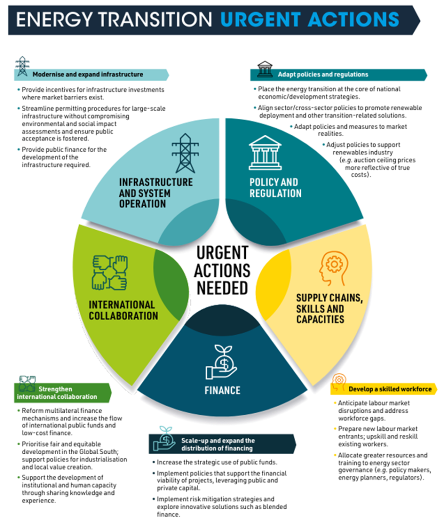 Se requiere una transición energética global sistémica para superar las barreras estructurales que impiden el progreso. Entre los principales facilitadores figuran el establecimiento de infraestructuras de apoyo, marcos normativos sólidos y el desarrollo de capacidades institucionales y humanas, respaldadas por una mayor financiación y una sólida cooperación internacional. La triplicación de la capacidad de energía renovable requerirá condiciones propicias para un progreso acelerado, ya que persisten numerosos obstáculos, en particular en lo que respecta a la infraestructura física, las políticas y reglamentos, y el desarrollo de competencias. Por lo tanto, es necesario actuar para: