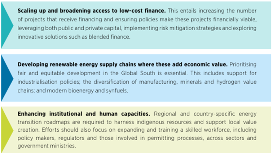 Los cambios estructurales, en particular la reforma de los mecanismos financieros multilaterales, son esenciales para apoyar eficazmente los esfuerzos de transición energética y la creación de valor local en los países en desarrollo. Es fundamental aumentar el apoyo internacional a los países en desarrollo, ya que se enfrentan a problemas específicos, como el costo prohibitivo del capital y su incapacidad para atraer inversiones privadas. El uso estratégico de las finanzas públicas será esencial para atraer inversiones a gran escala con el fin de lograr transiciones energéticas inclusivas que aporten beneficios socioeconómicos a todos. La cooperación internacional es necesaria en muchos frentes: